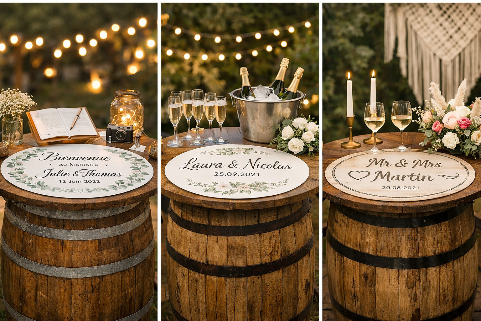 Apportez une touche unique et élégante à votre réception avec notre plateau personnalisé pour tonneau de vin. Parfait pour les mariages, ce plateau transforme une simple barrique en table décorative raffinée, idéale pour accueillir vos invités.